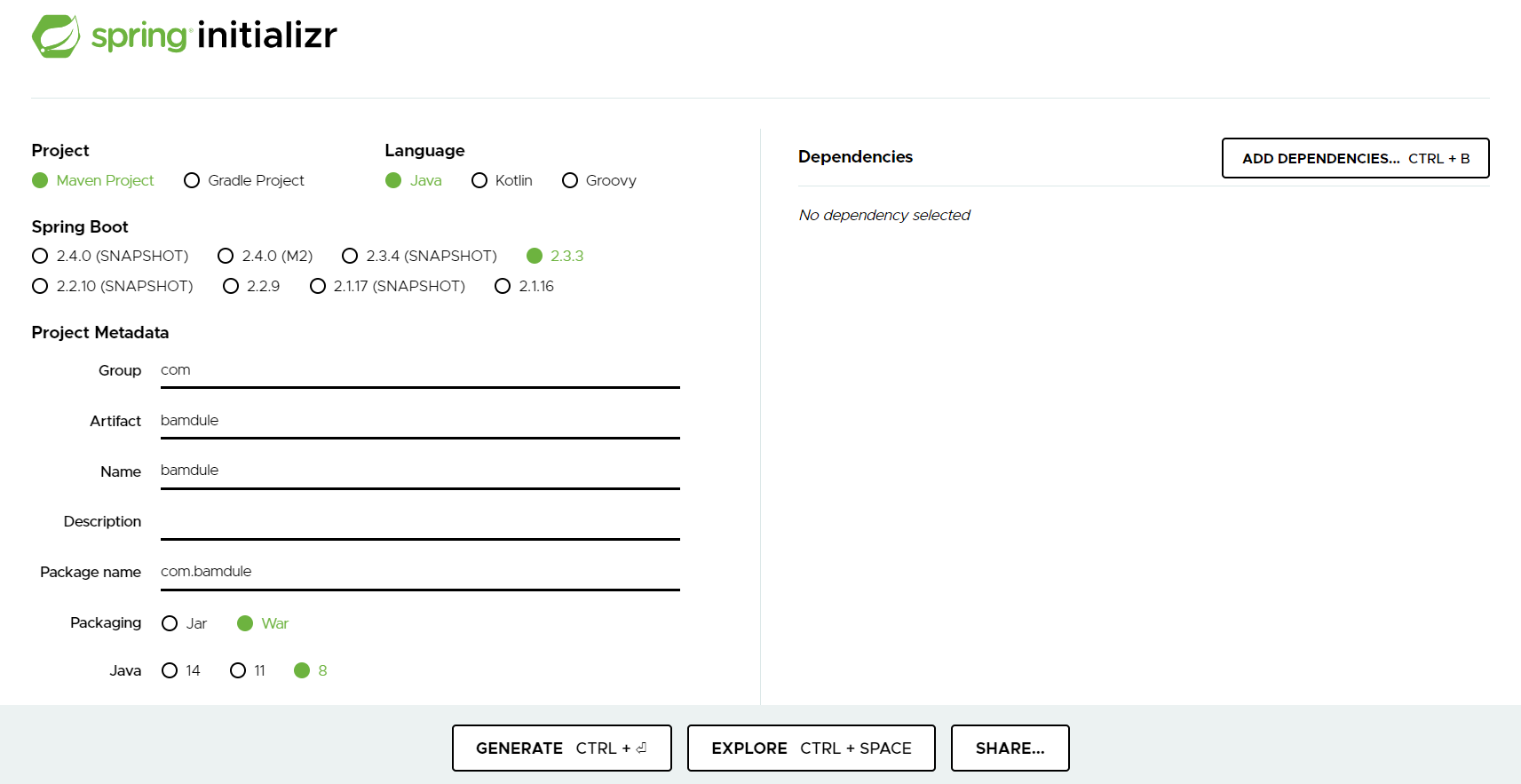 Spring Boot initializr 사이트로 이동해서 아래 그림과 같이 선택 후 프로젝트를 GENERATE 해주세요.