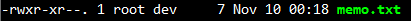memo.txt 파일의 소유자는 root고, 그룹은 dev입니다. "-rwxr-xr--" 값을 8진수로 변경하면 754를 의미합니다.