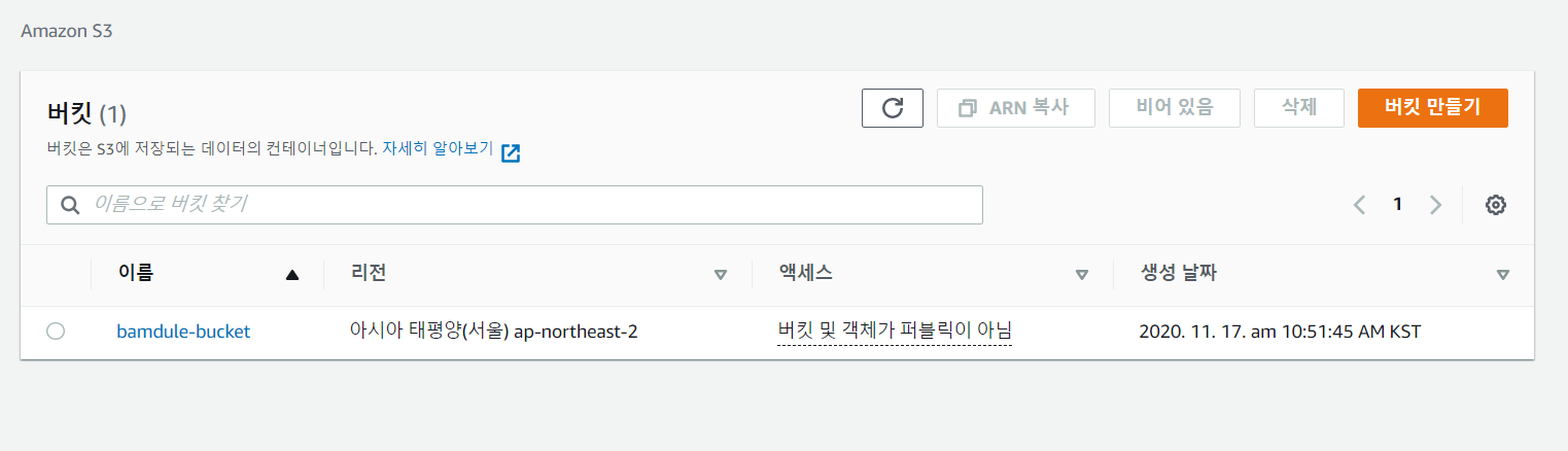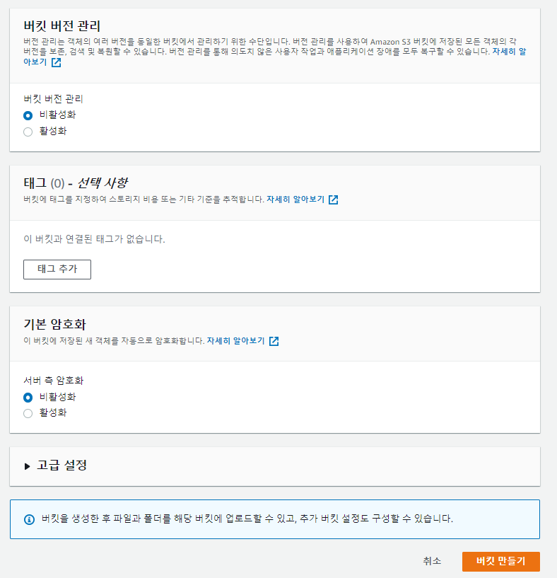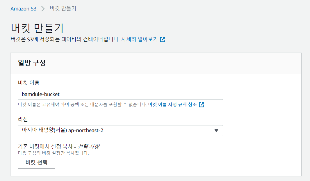 버킷 이름은 고유해야하고, 리전은 서비스 지역에 따라서 설정해주면 됩니다.