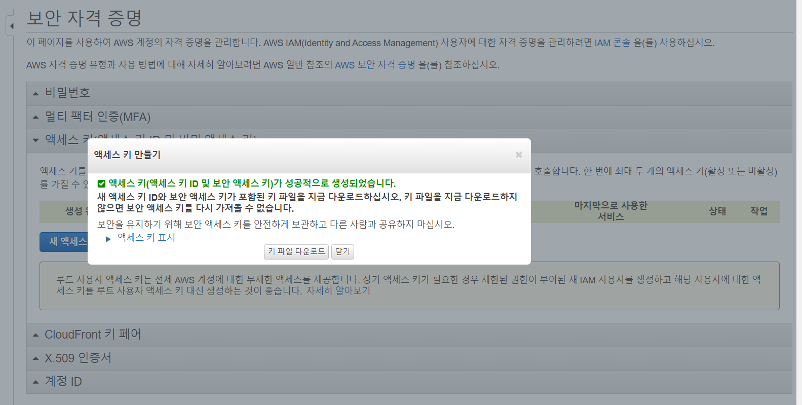 액세스 키를 생성하면 키 파일을 다운로드 받을 수 있고 해당 파일에 AWSAccessKeyId와 AWSSecretKey가 명시되어있습니다. AWSAccessKeyId와 AWSSecretKey는 절때 외부에 노출되어서는 안됩니다.