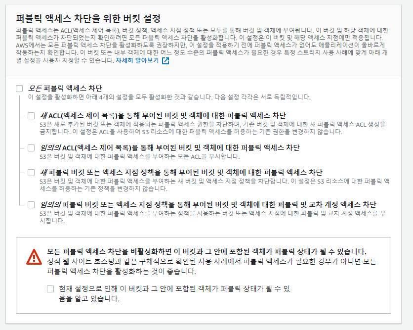 외부에 S3를 공개할 경우 모든퍼블릭 액세스 차단 체크를 해제해주면 됩니다.
