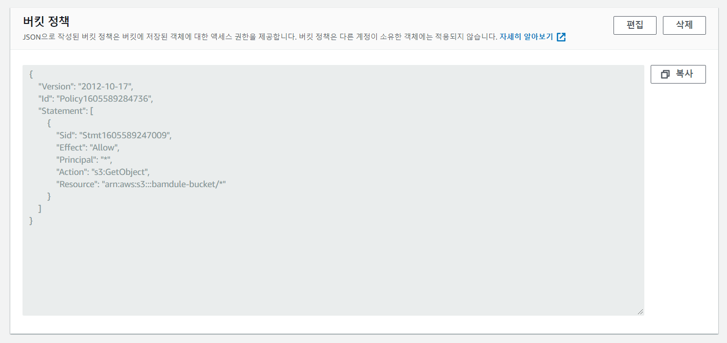 정책이 명시된 JSON 값을 복사 한 뒤 버킷 정책에 입력해주세요.