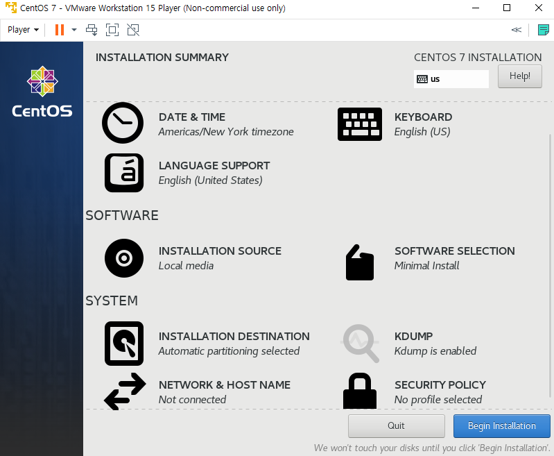 설정이 완료되었다면, Begin Installation 버튼을 눌러주세요.