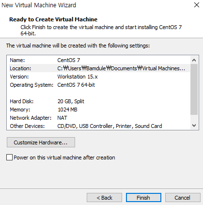 Finish를 누르면 가상의 CentOS가 생성됩니다.