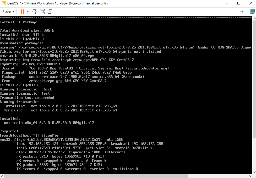 yum install net-tools 명령어를 입력해 net-tools를 설치해줍니다.