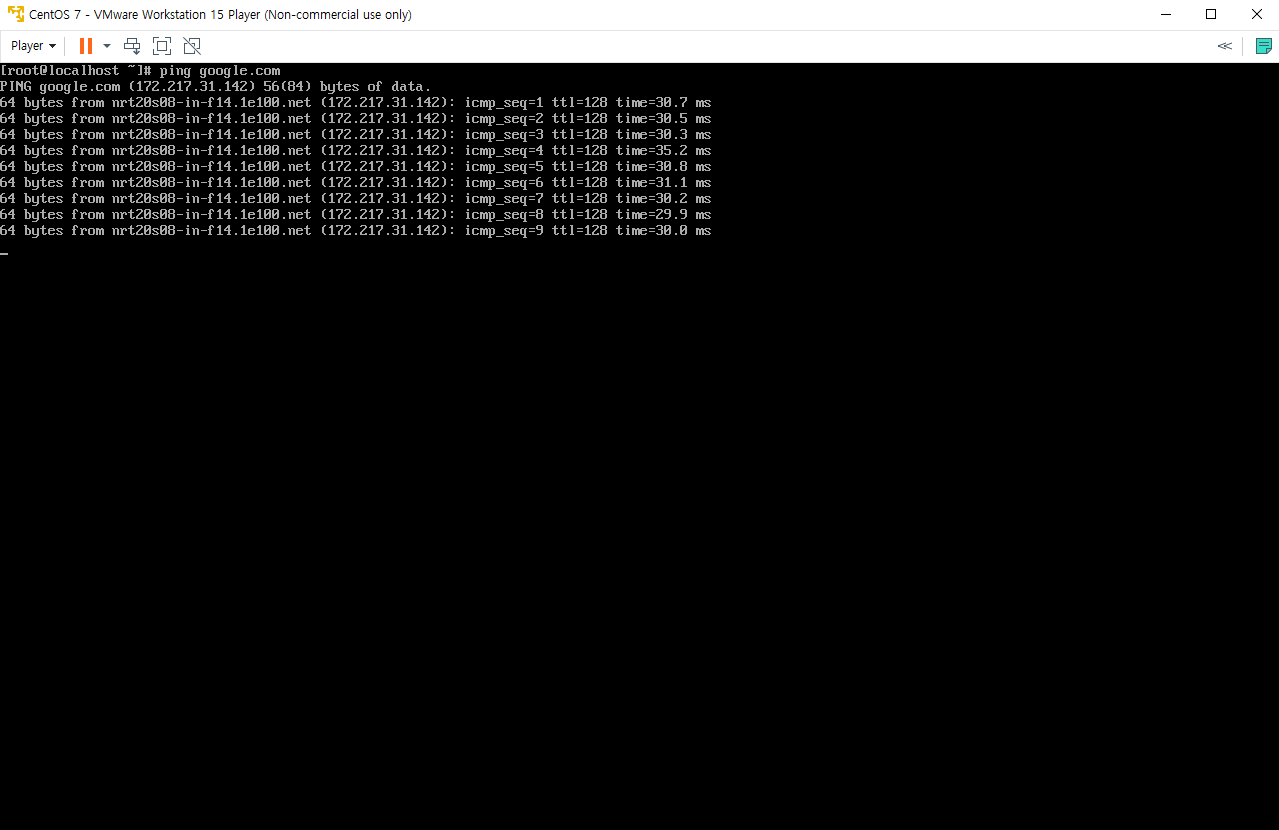 ping google.com을 입력해 인터넷이 연결되었는지 확인합니다.