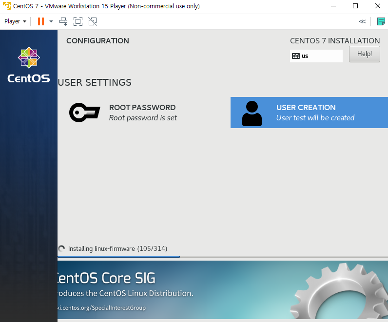 설치가 진행되는 동안 ROOT PASSWORD와 USER CREATION을 설정해주세요.