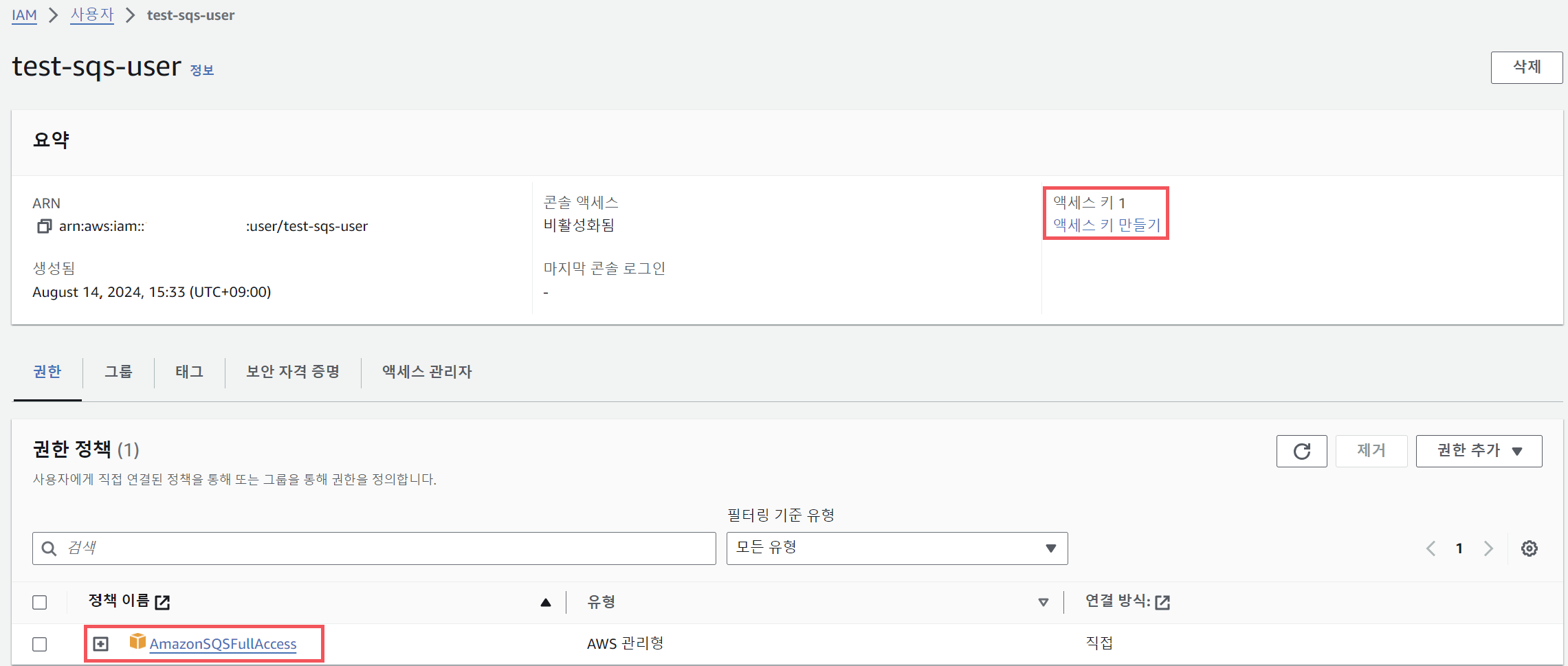 SQS 전용 IAM 사용자를 생성했다면 액세스 키를 만들고 ARN을 복사해 두자.
