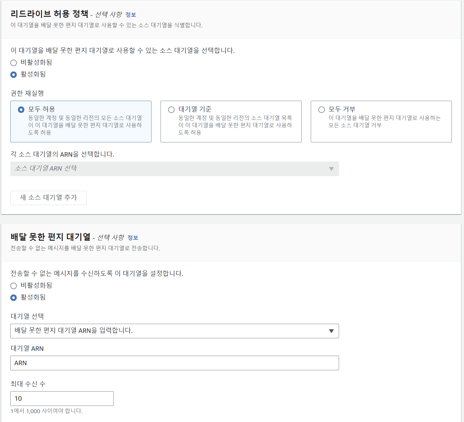 - 이전에 생성해둔 SQS IAM에 대한 ARN 링크를 복사해서 큐 전송자와 큐 수신자에 입력한다.