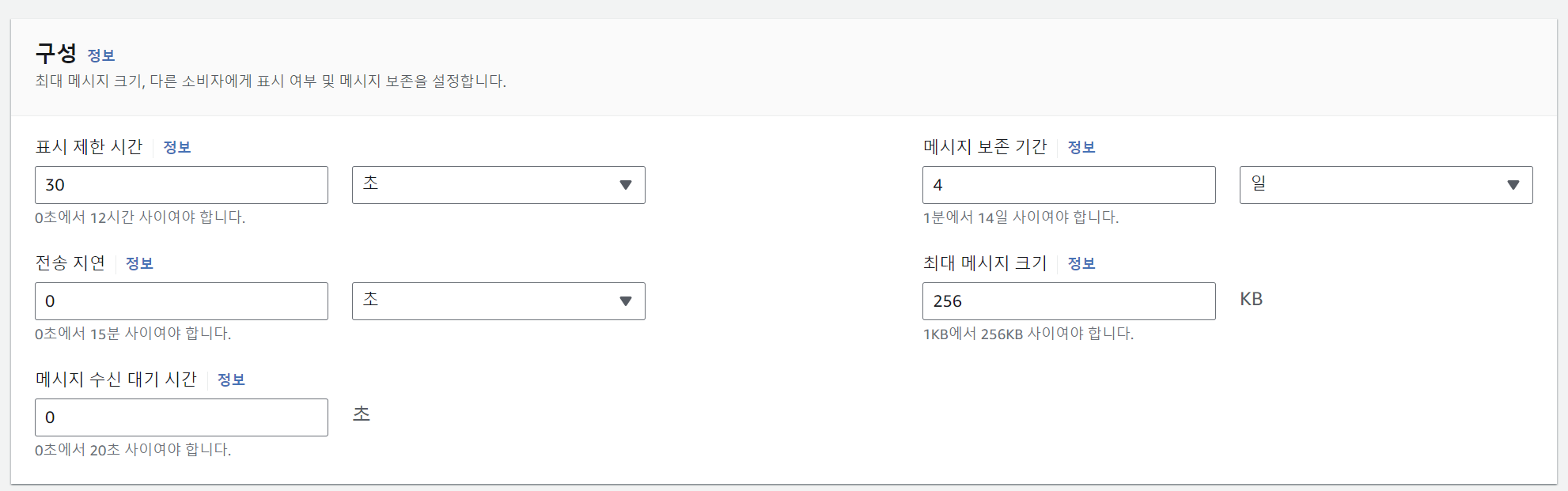 - 메시지 보존 기간은 큐에 들어온 메시지가 큐에서 삭제되지 않고 보관되는 최대 시간을 설정한다. 메시지가 이 기간 동안 처리되지 않으면, 자동으로 삭제된다.