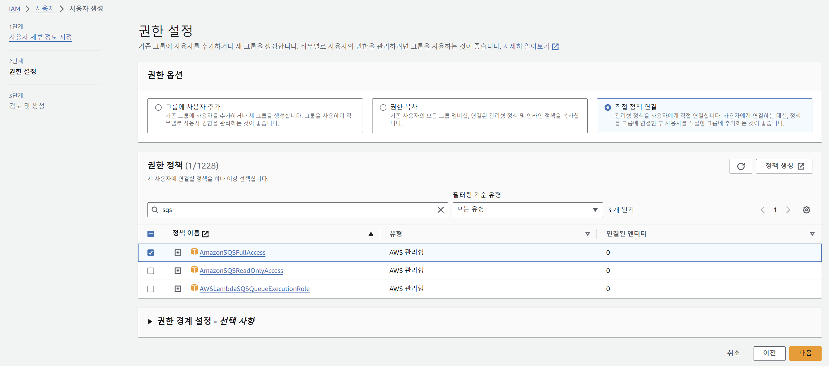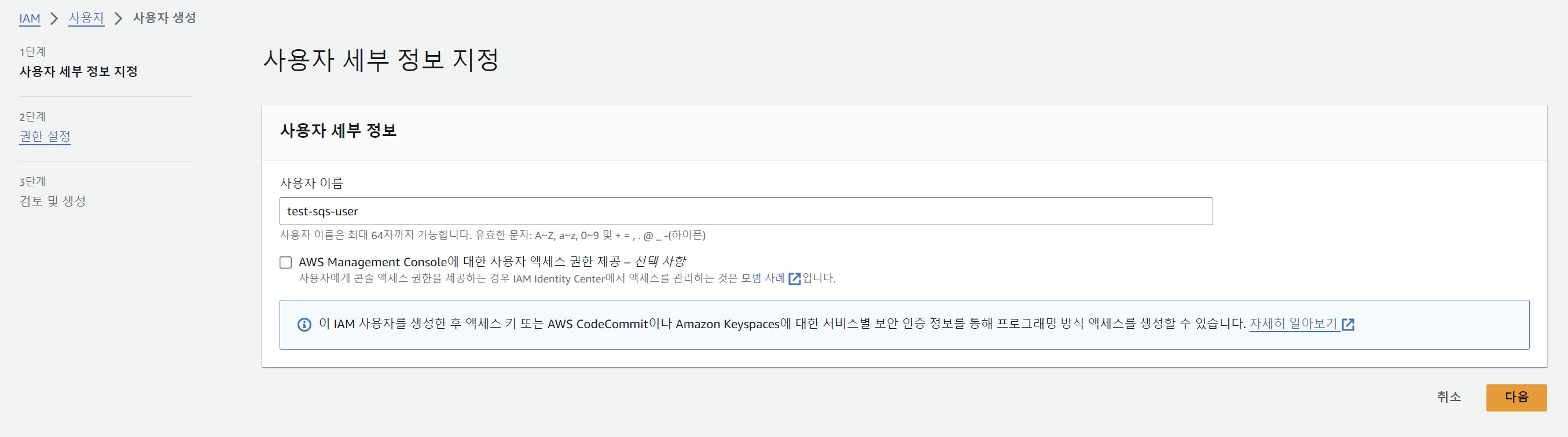 - 큐 전송자와 수신자를 별도의 사용자로 나누고 싶다면 IAM 사용자를 추가로 생성해주면 된다.
