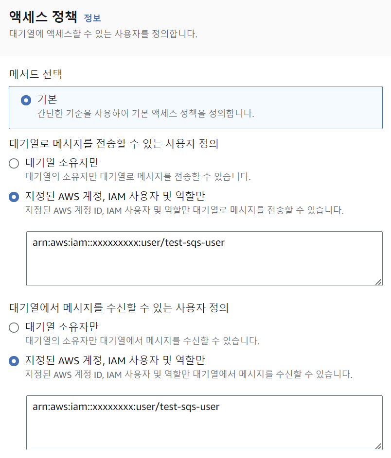 - IAM 사용자 외에도 역할에 SQS 관련 권한을 넣어주고 해당 역할에 대한 ARN 정보를 입력해도 된다.