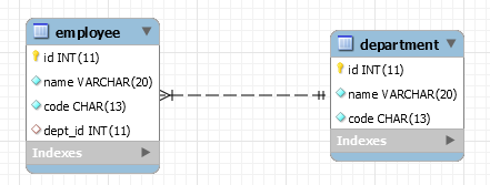 department(부서)와 employee(회사원) 테이블이 있다. department이 부모 테이블이고, employee가 자식 테이블이다.