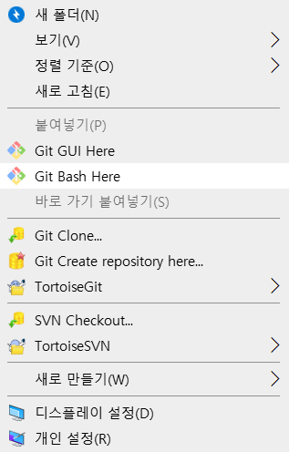 Git Bash Here : 폴더에서 우클릭 시, 해당 경로를 기준으로 Git Bash 실행